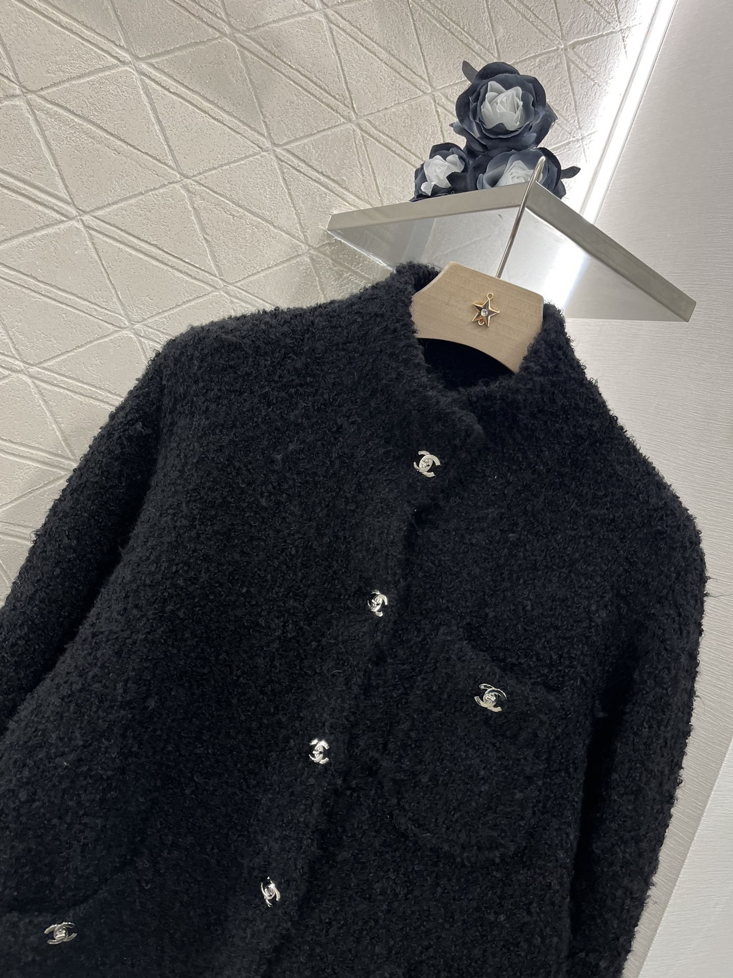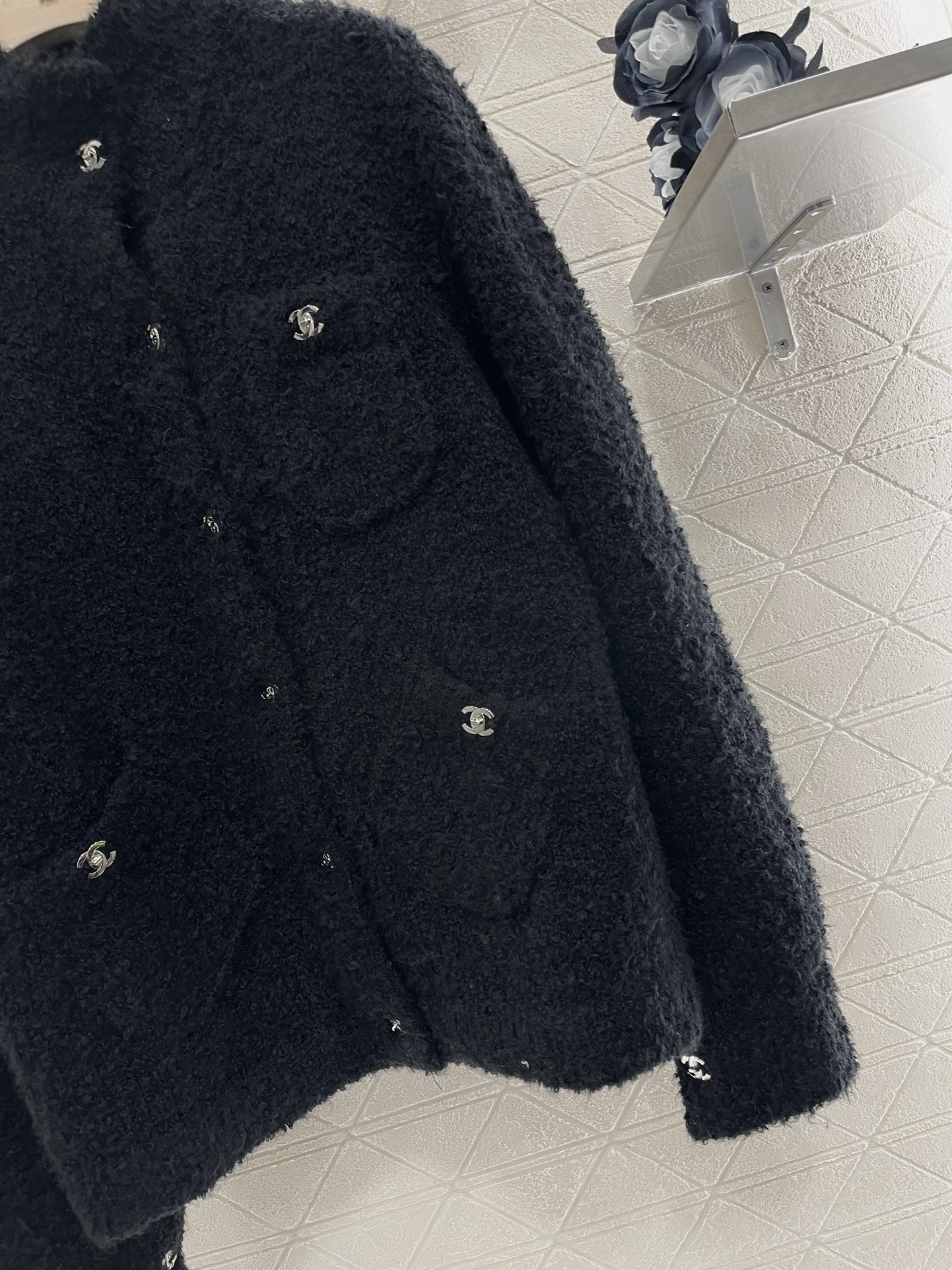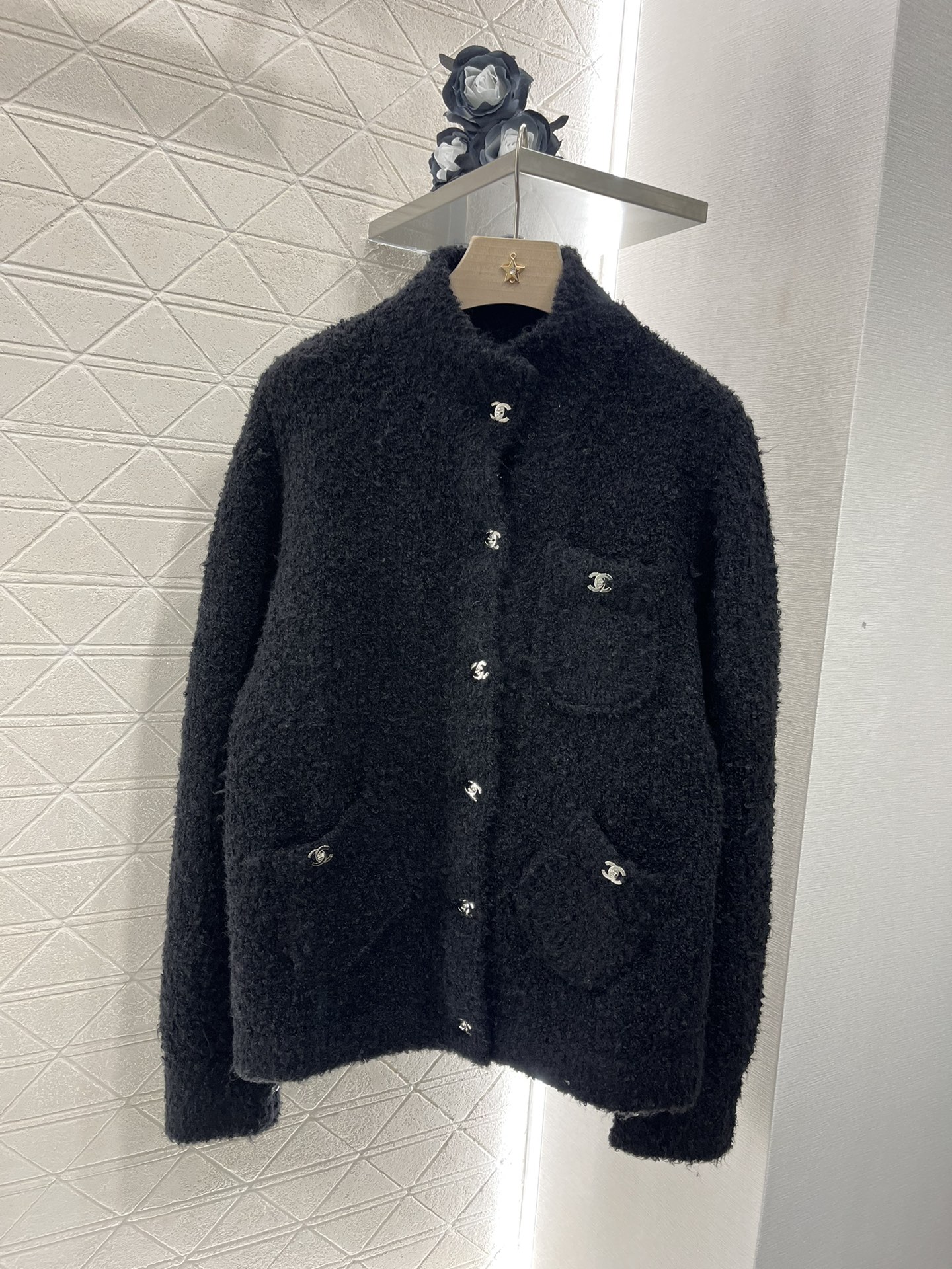 샤넬 라펠 포켓 울 니트 가디건 블랙