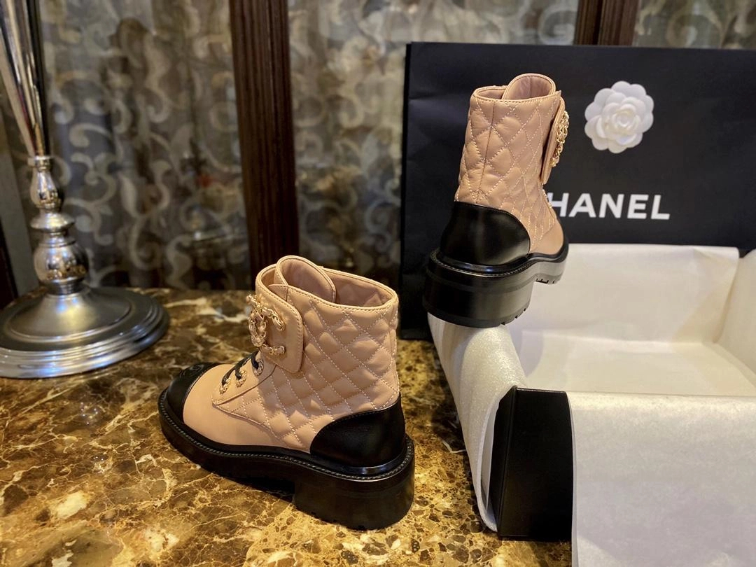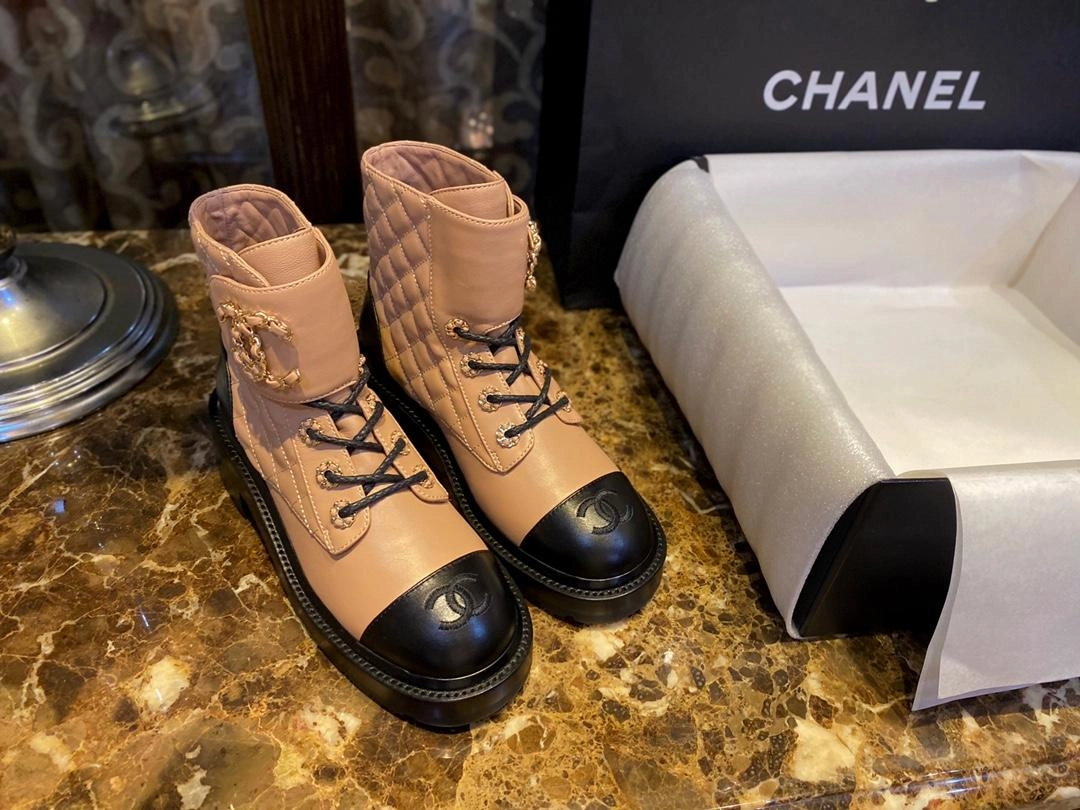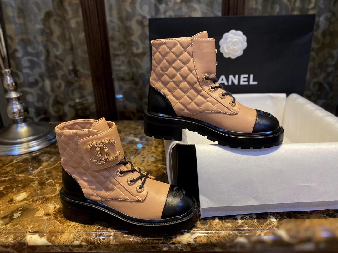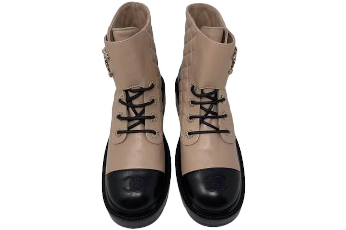 샤넬 레이스업 퀼팅 컴뱃 부츠 베이지