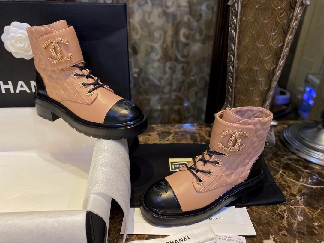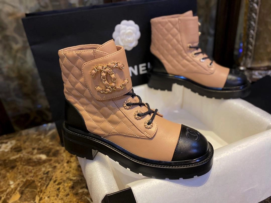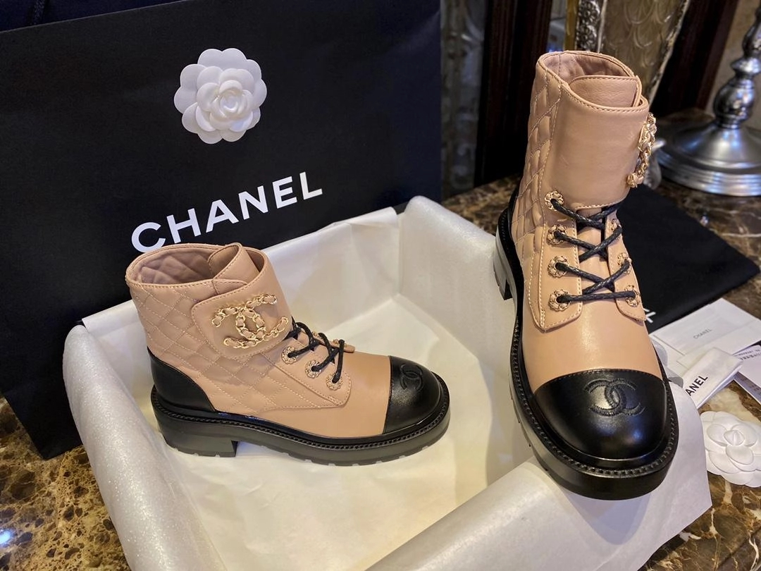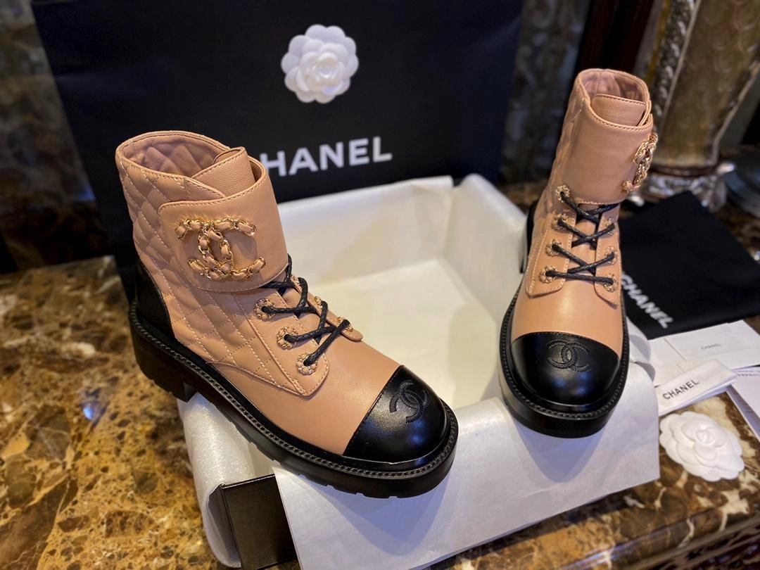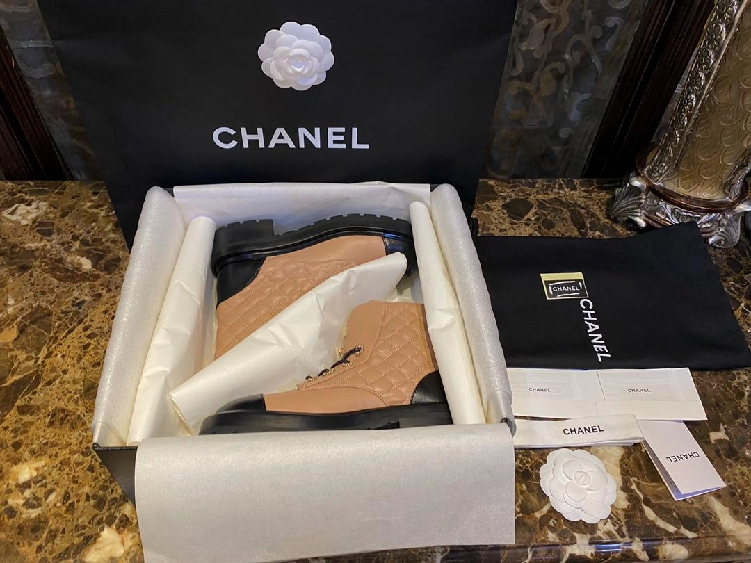 샤넬 레이스업 퀼팅 컴뱃 부츠 베이지